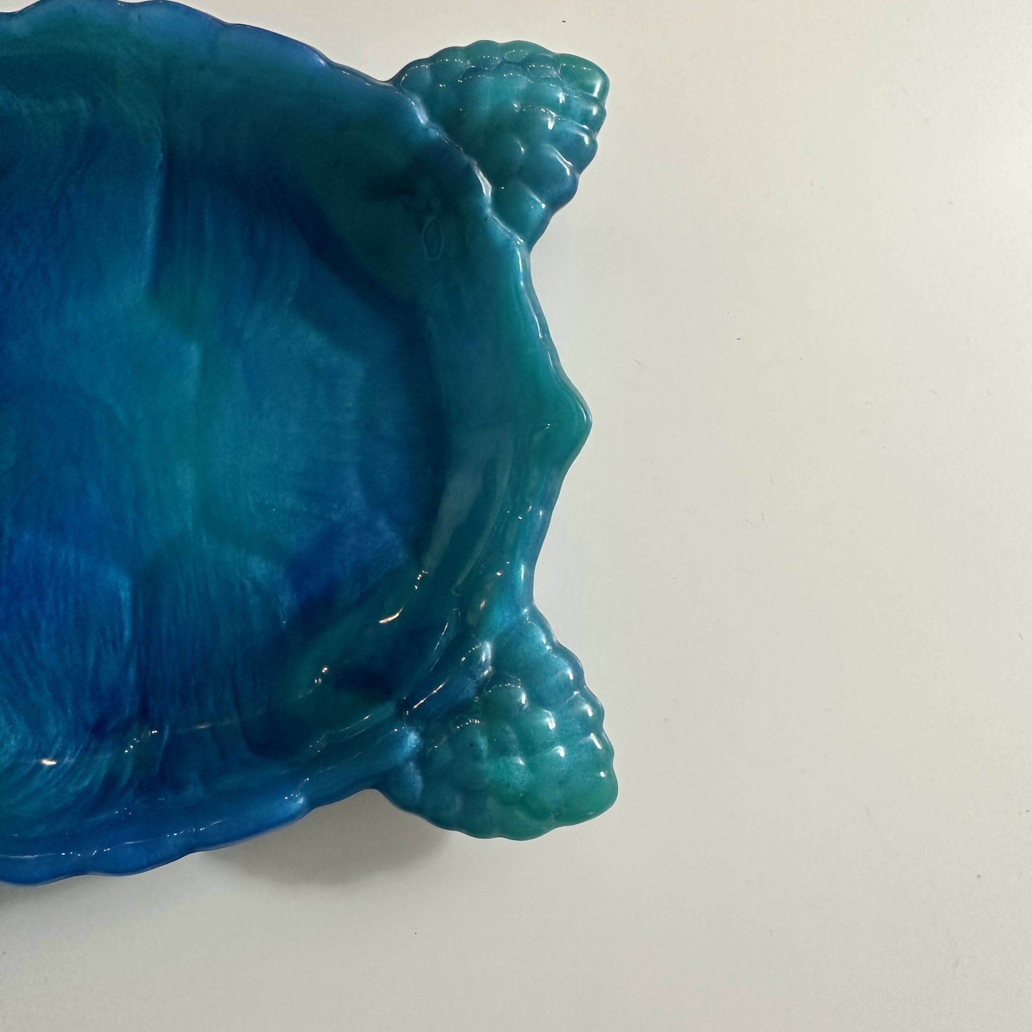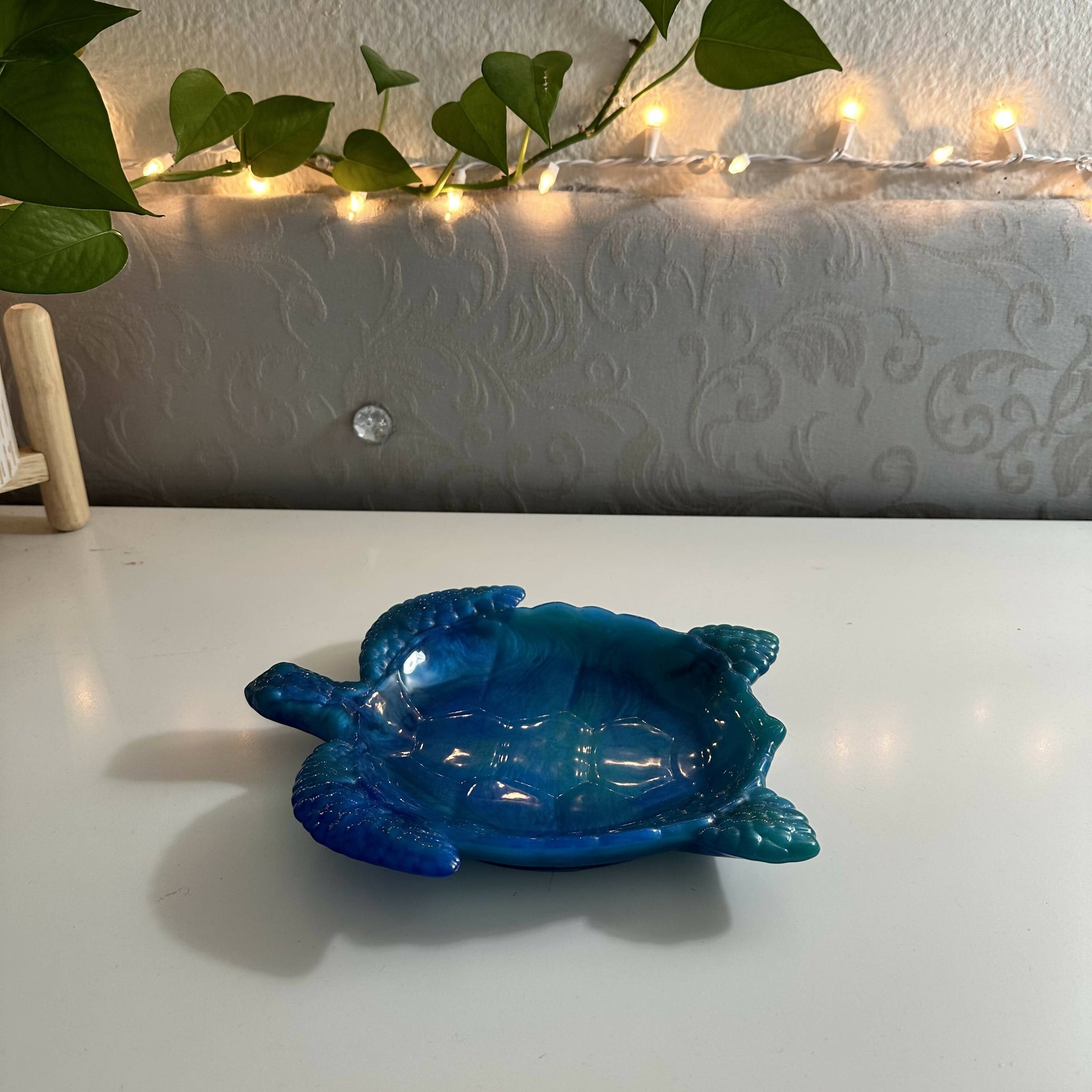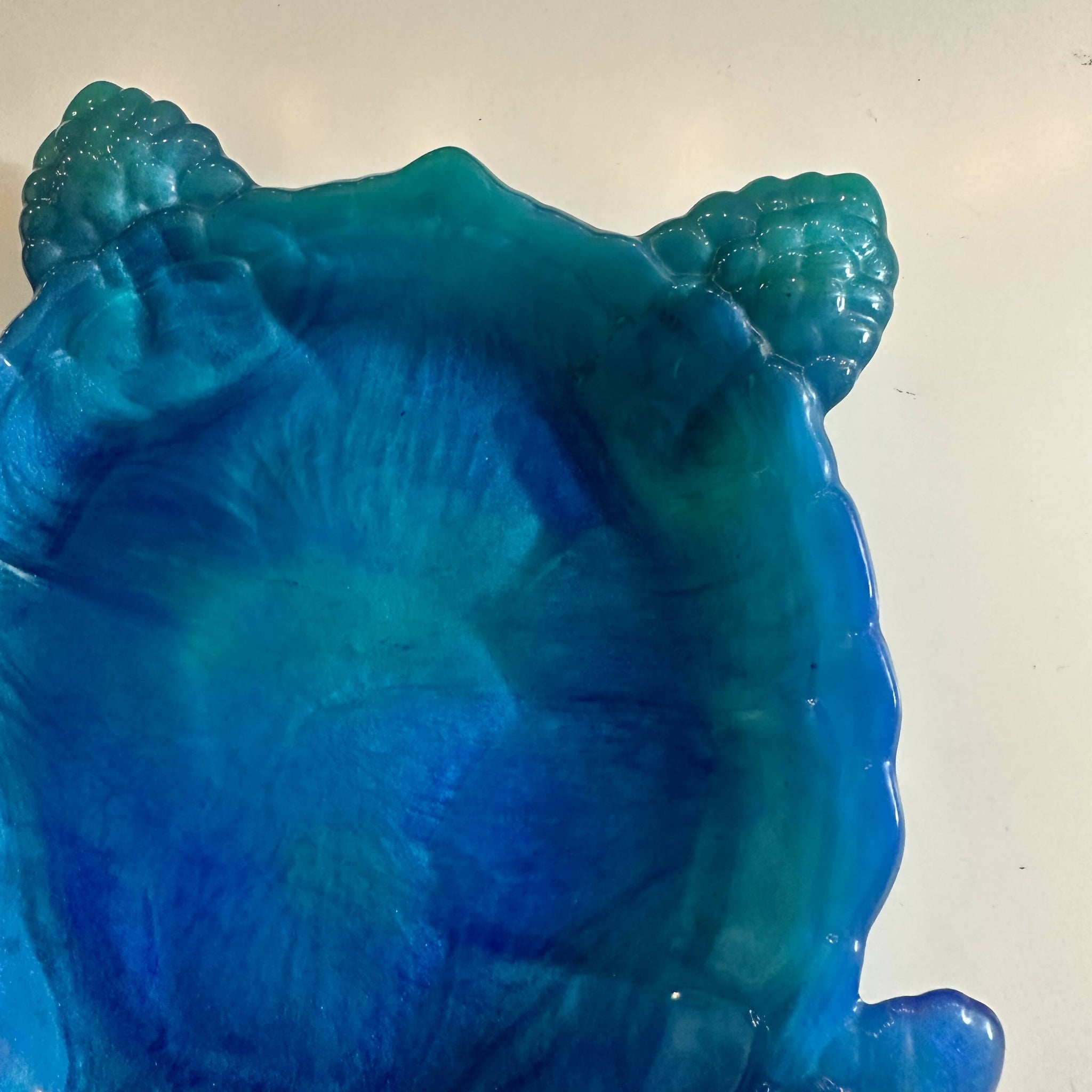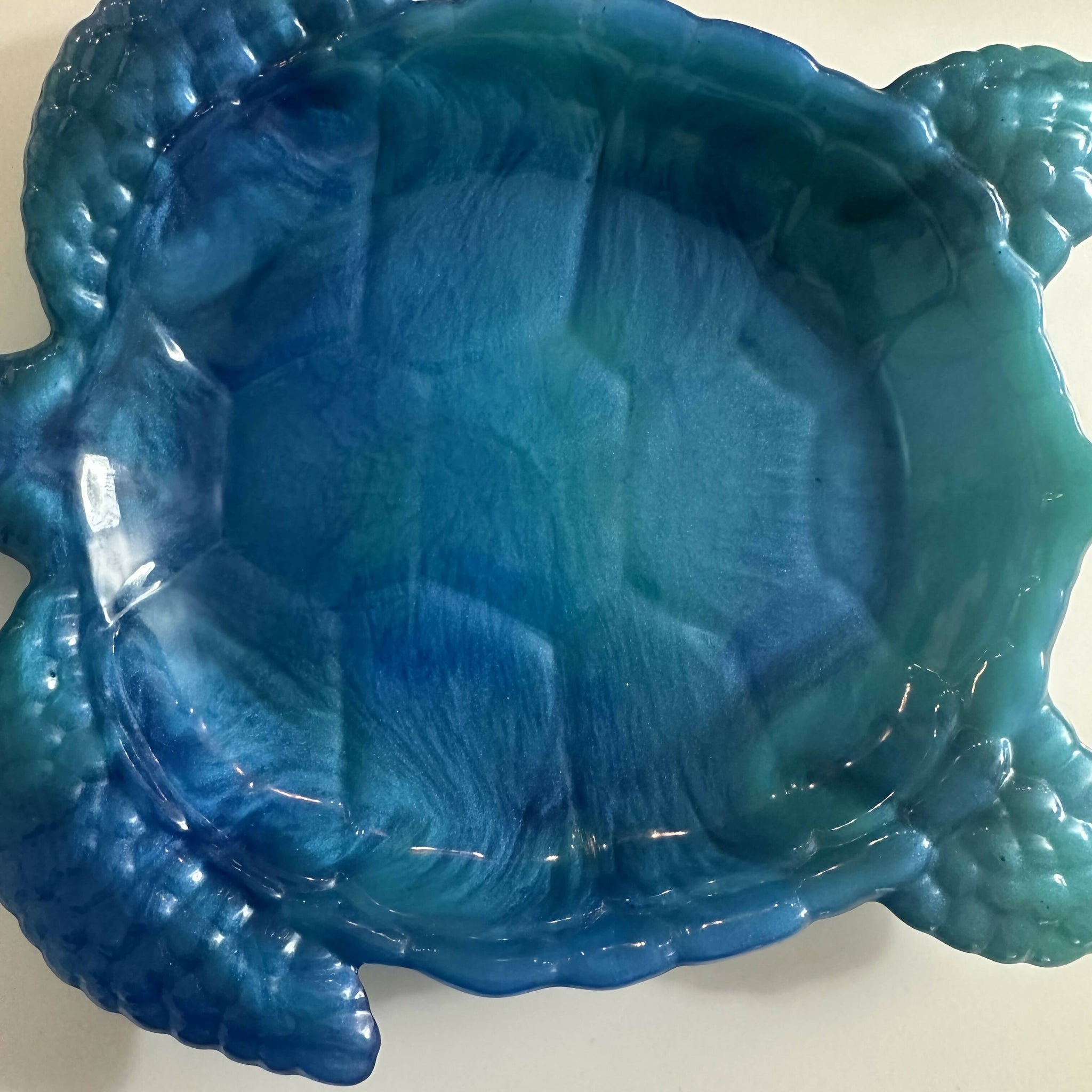Various shades of blue and green resin sea turtle trinket tray. Approximately 8”x9”.